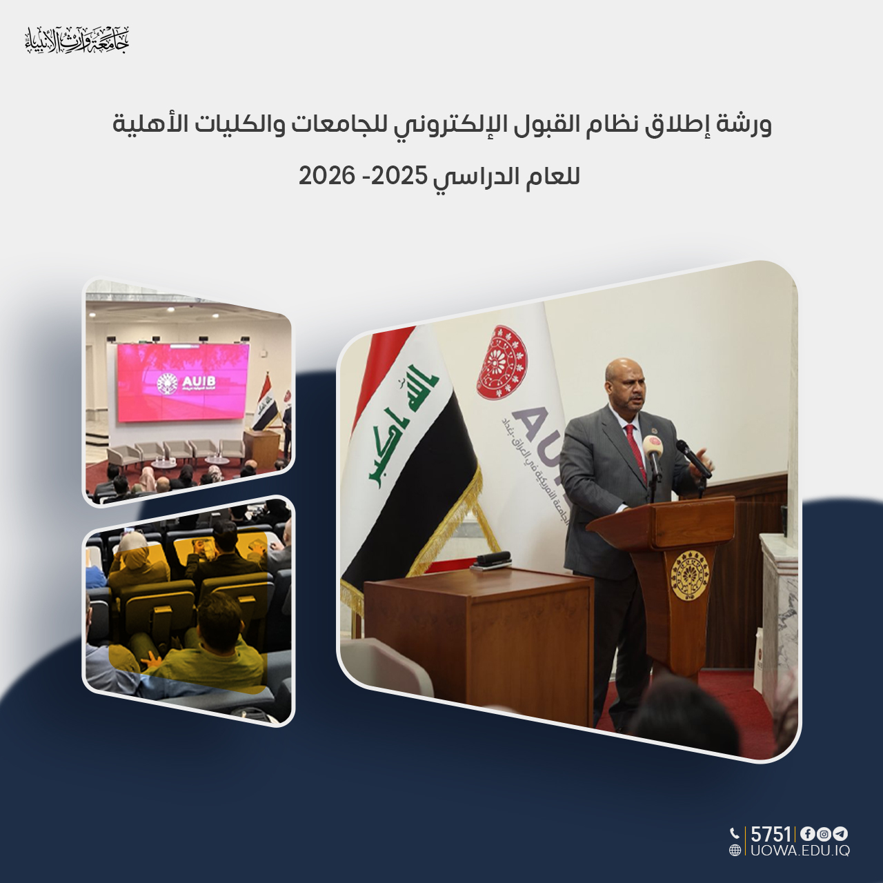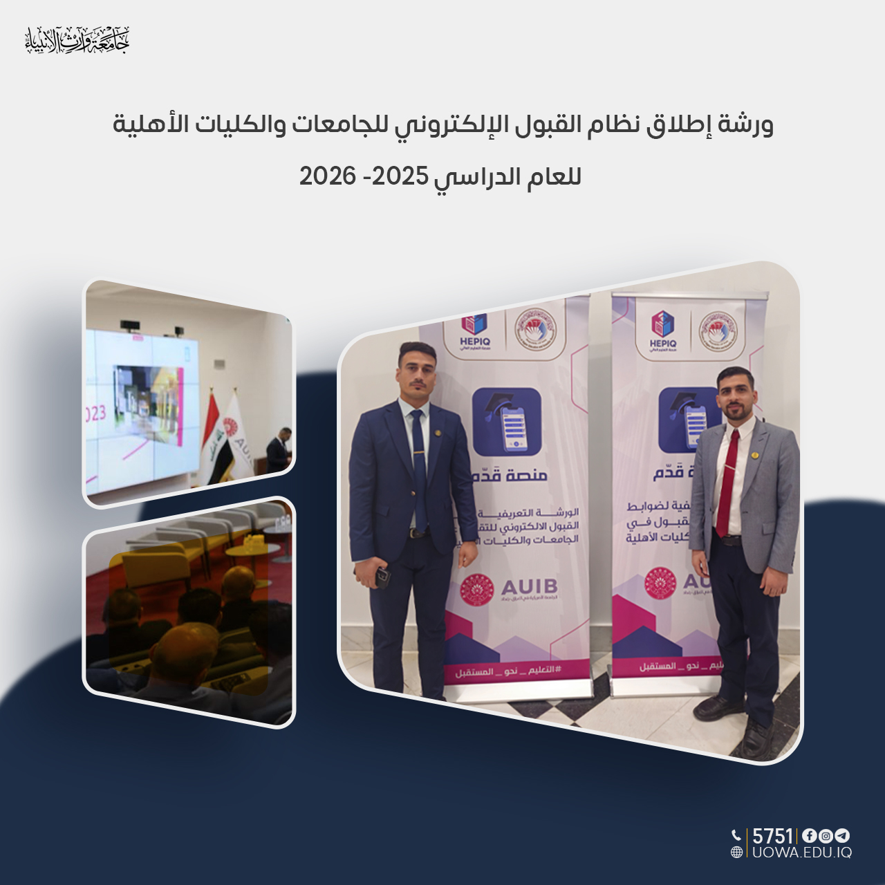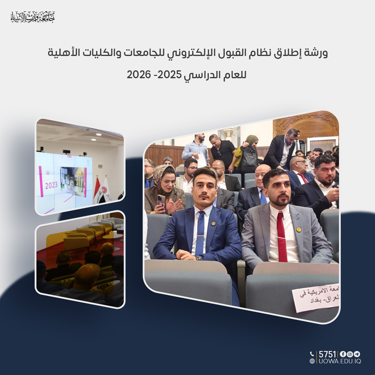 شارك رئيس قسم التسجيل والشؤون الطلابية السيد مؤيد سمير الخفاف وثلةٌ من موظفي القسم في الورشة التي أعدّتها وزارة التعليم العالي والبحث العلمي بشأن إطلاق نظام القبول الإلكتروني للجامعات والكليات الأهلية للعام الدراسي 2025-2026،