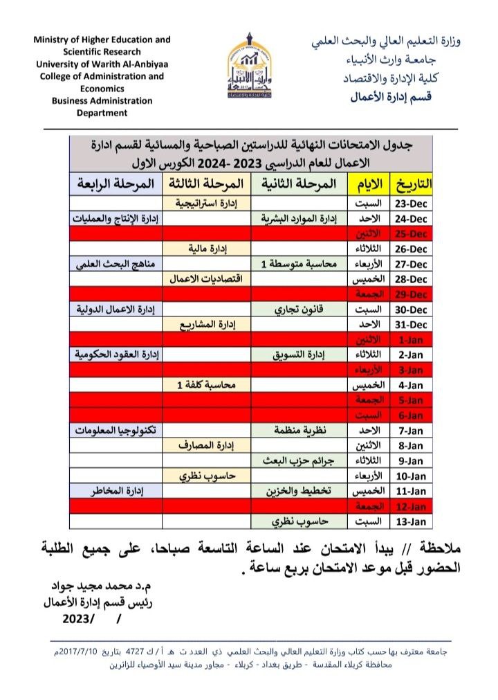 جدول الامتحانات النهائية للدراستين الصباحية والمسائية لقسم ادارة الاعمال للعام الدراسي 2024-2025 الكورس الاول