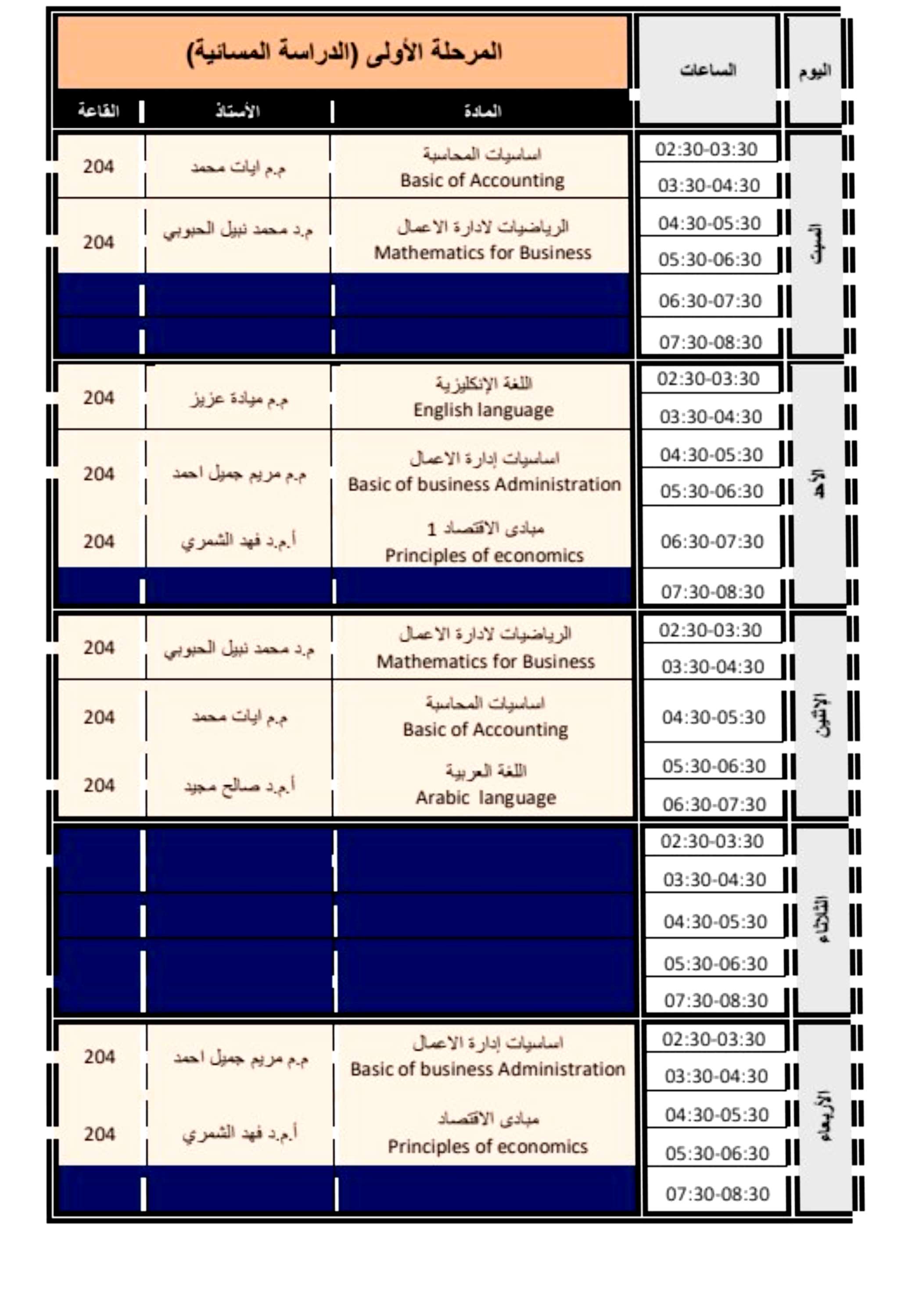الجدول الاسبوعي لكلية الإدارة والاقتصاد الاسبوعي قسم إدارة الأعمال المرحلة الأولى 2024-2025