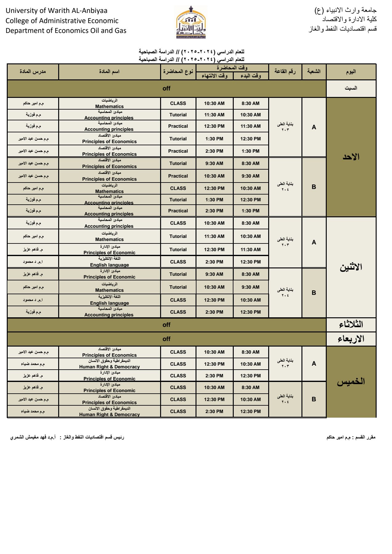 جدول كلية الإدارة والاقتصاد قسم اقتصاديات النفط والغاز للمرحلة الأولى 2024-2025