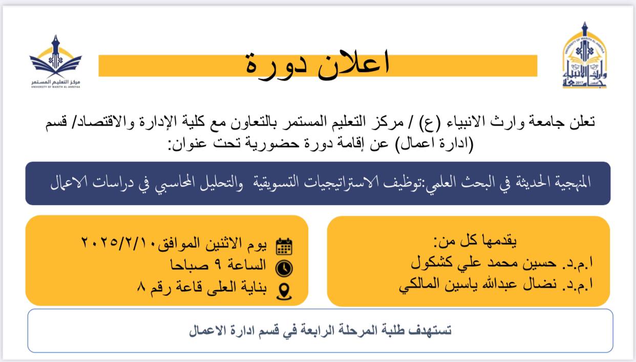 تقيم كلية الادارة والاقتصاد في جامعة وارث الانبياء (عليه السلام)  قسم ادارة اعمال دورة مدتها ثلاثة ايام حول "المنهجية الحديثة في البحث العلمي : توظيف الاستراتيجيات التسويقية والتحليل المحاسبي في دراسات الاعمال" يقدمها كلا من الاستاذ المساعد الدكتور حسين محمد علي كشكول والاستاذة المساعدة الدكتورة نضال عبد الله ياسين المالكي
