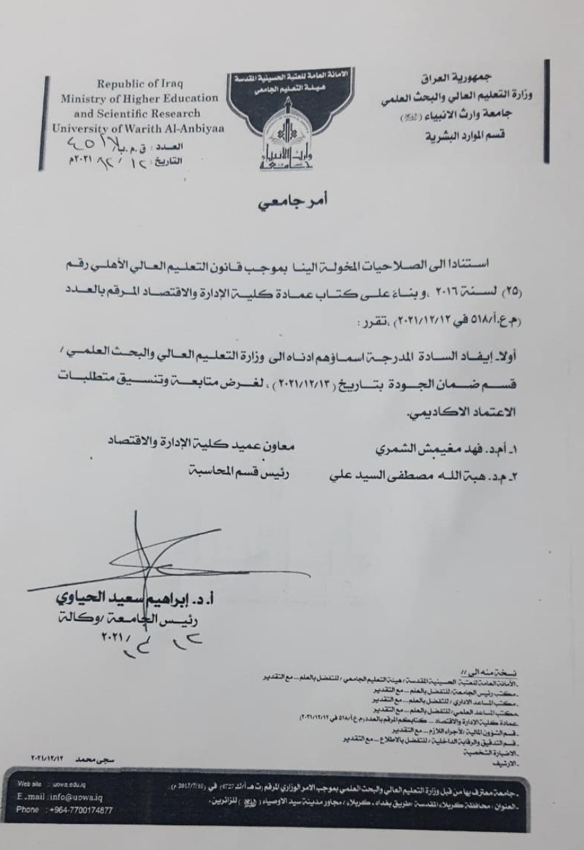 في يوم الإثنين المصادف ١٣/١٢/٢٠٢١ زار كل من أ.م.د فهد الشمري معاون عميد كلية الادارة والاقتصاد ؛ و م.د هبة الله مصطفى رئيس قسم المحاسبة ، وزارة التعليم العالي والبحث العلمي/ قسم ضمان الجودة /قسم الاعتماد ؛ اذ تم القاء مع مدير ضمان الجودة ثم مع أ.د يسرى محمد عبد الله مدير قسم الاعتماد وتم الآتي :