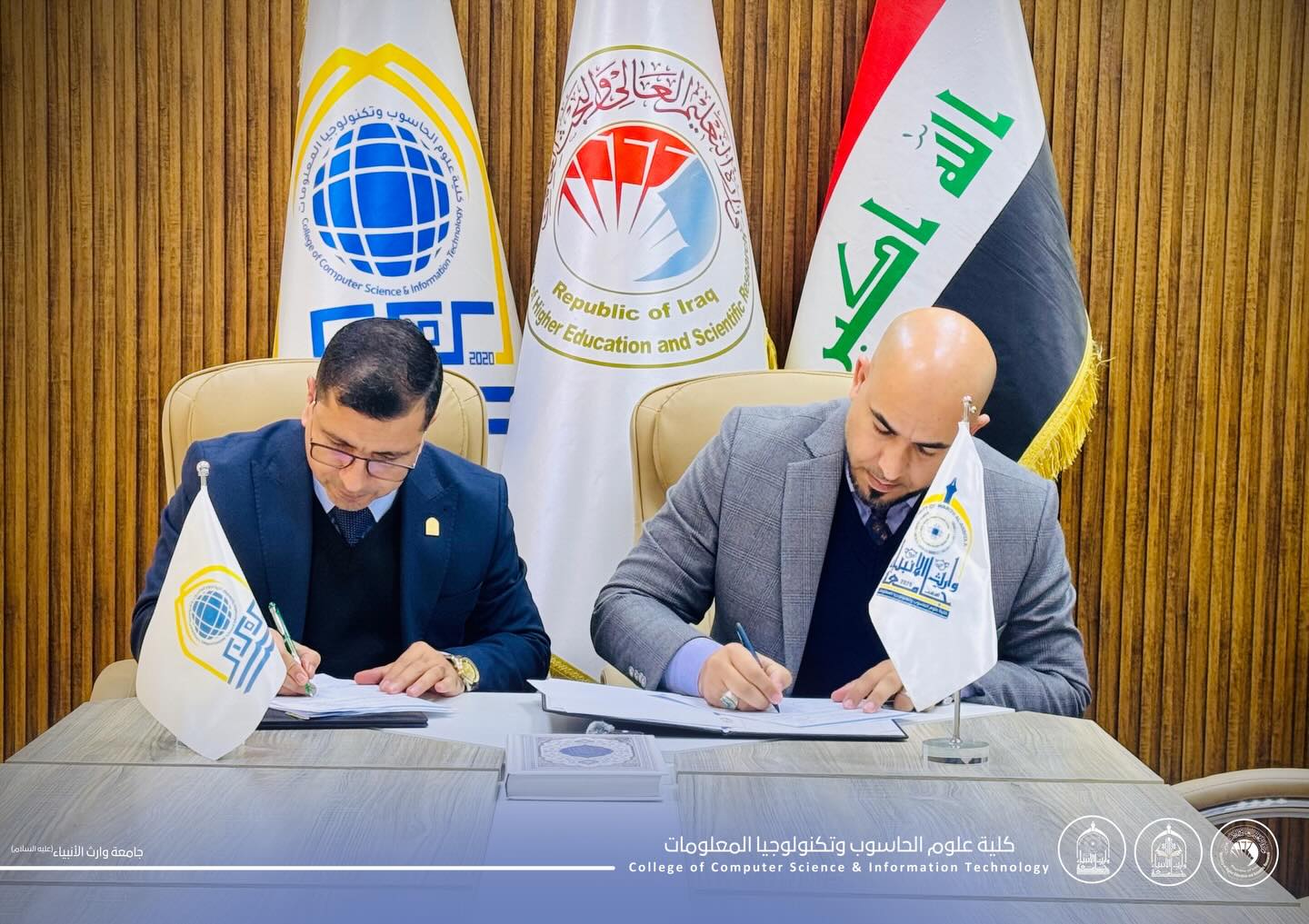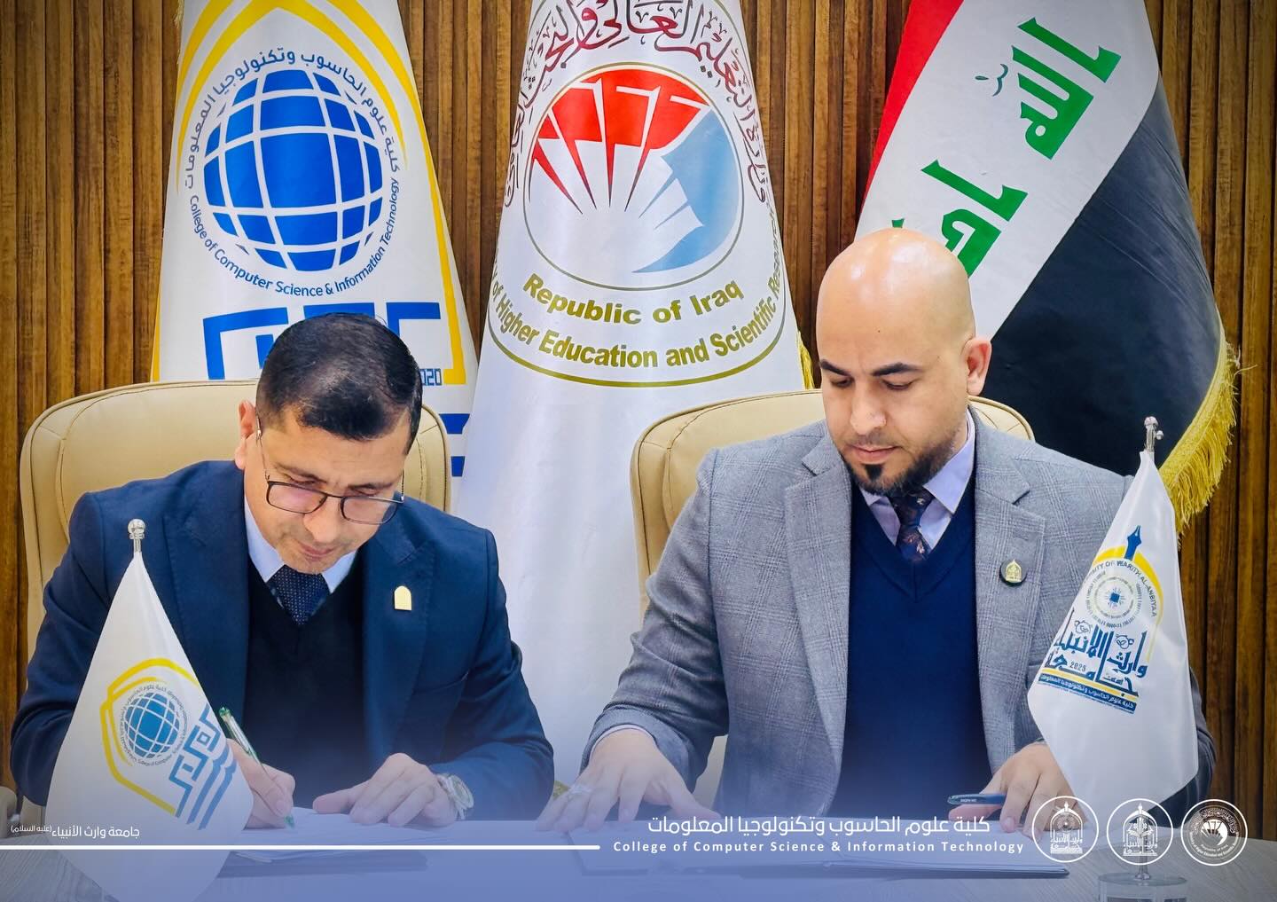 توقيع اتفاقية توأمة علمية بين كلية علوم الحاسوب وتكنولوجيا المعلومات في جامعة وارث الانبياء عليه السلام وجامعة كربلاء لتعزيز التعاون الأكاديمي.