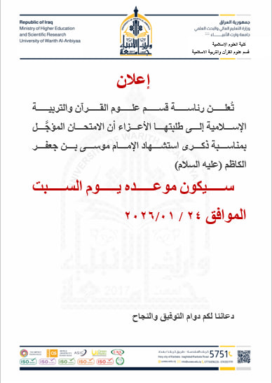 تُعلن رئاسة قسم علوم القرآن والتربية الإسلامية إلى طلبتها الأعزاء أن الامتحان المؤجَّل بمناسبة ذكرى استشهاد الإمام موسى بن جعفر الكاظم (عليه السلام)