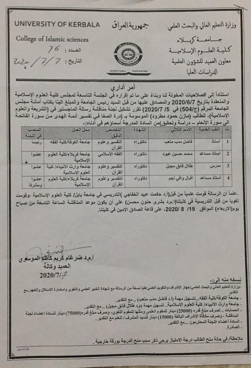 قدم عميد كلية العلوم الإسلامية المحترم ( الدكتور طلال فائق الكمالي) شكر وعرفان للكادر التدريسي تقديرا لجهودهم في العام الدراسي 2019_2020