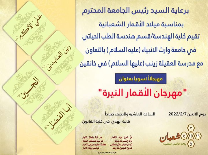 برعاية السيد رئيس جامعة وارث الأنبياء (عليه السلام) تقيم كلية الهندسة/ قسم هندسة الطب الحياتي في الجامعة مهرجان " الأقمار النيرة"، بمناسبة ميلاد الأقمار المحمدية، وبالتعاون مع مدرسة العقيلة زينب (عليها السلام) في خانقين.