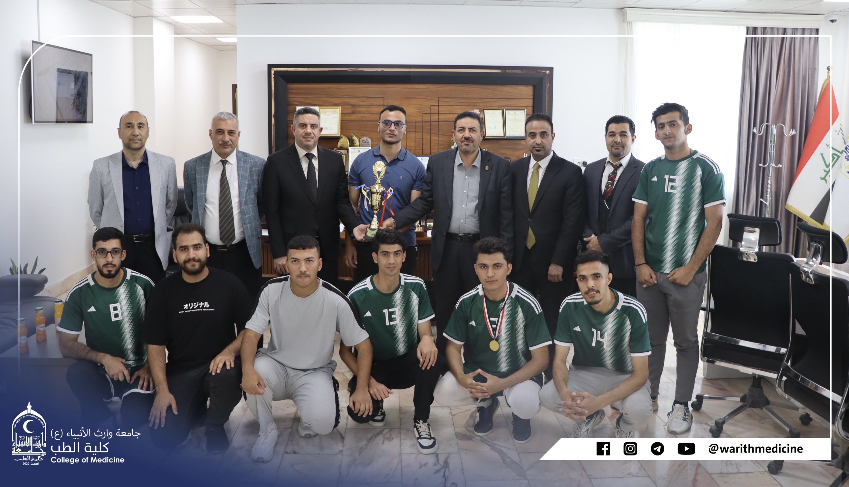 عمادة كلية الطب متمثلة بالسيد عميد الكلية الاستاذ الدكتور علي عبد سعدون المحترم تهنئ فريق طلبة المرحلة الخامسة لحصولهم على المركز الثاني في بطولة الجامعة متمنين لهم دوام النجاح والتألق في النشاطات الرياضية الجامعية .