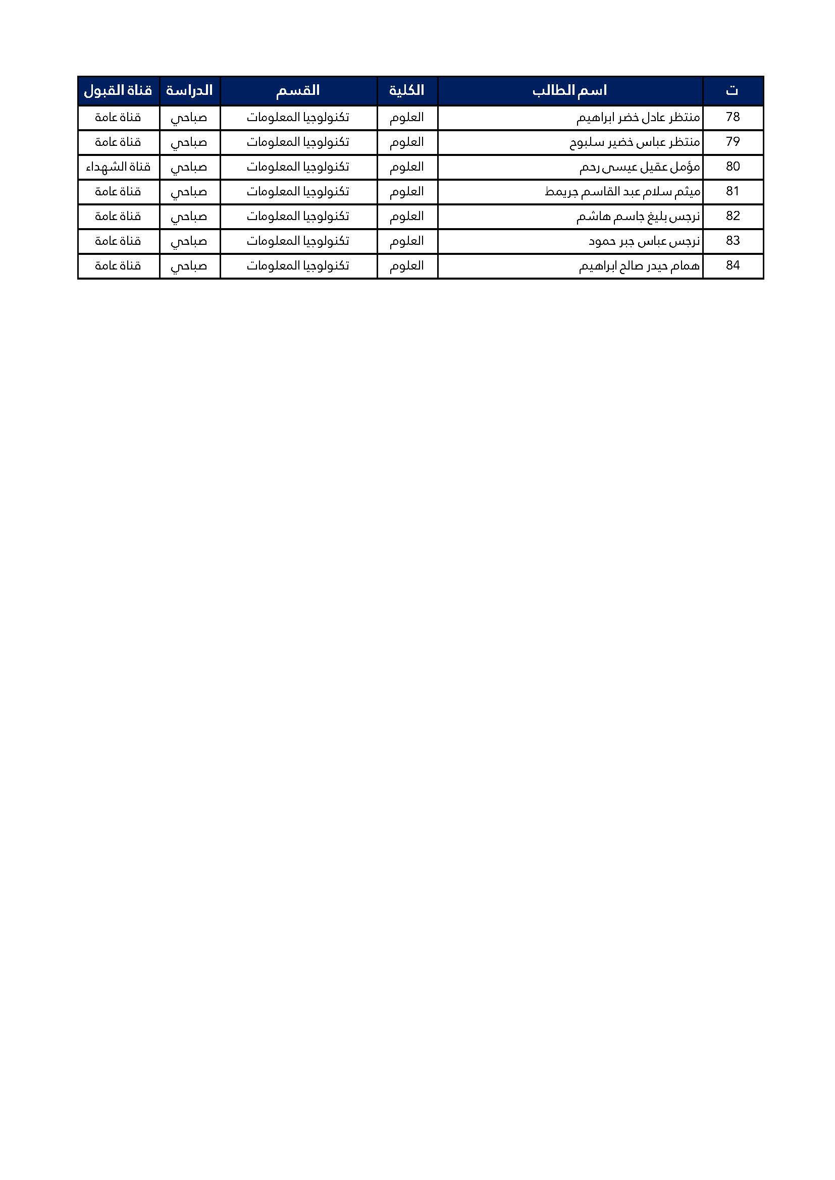 اسماء الطلبة المقبولين للدراسة الصباحية للمرحلة الاولى كلية العلوم قسم تكنولوجيا المعلومات