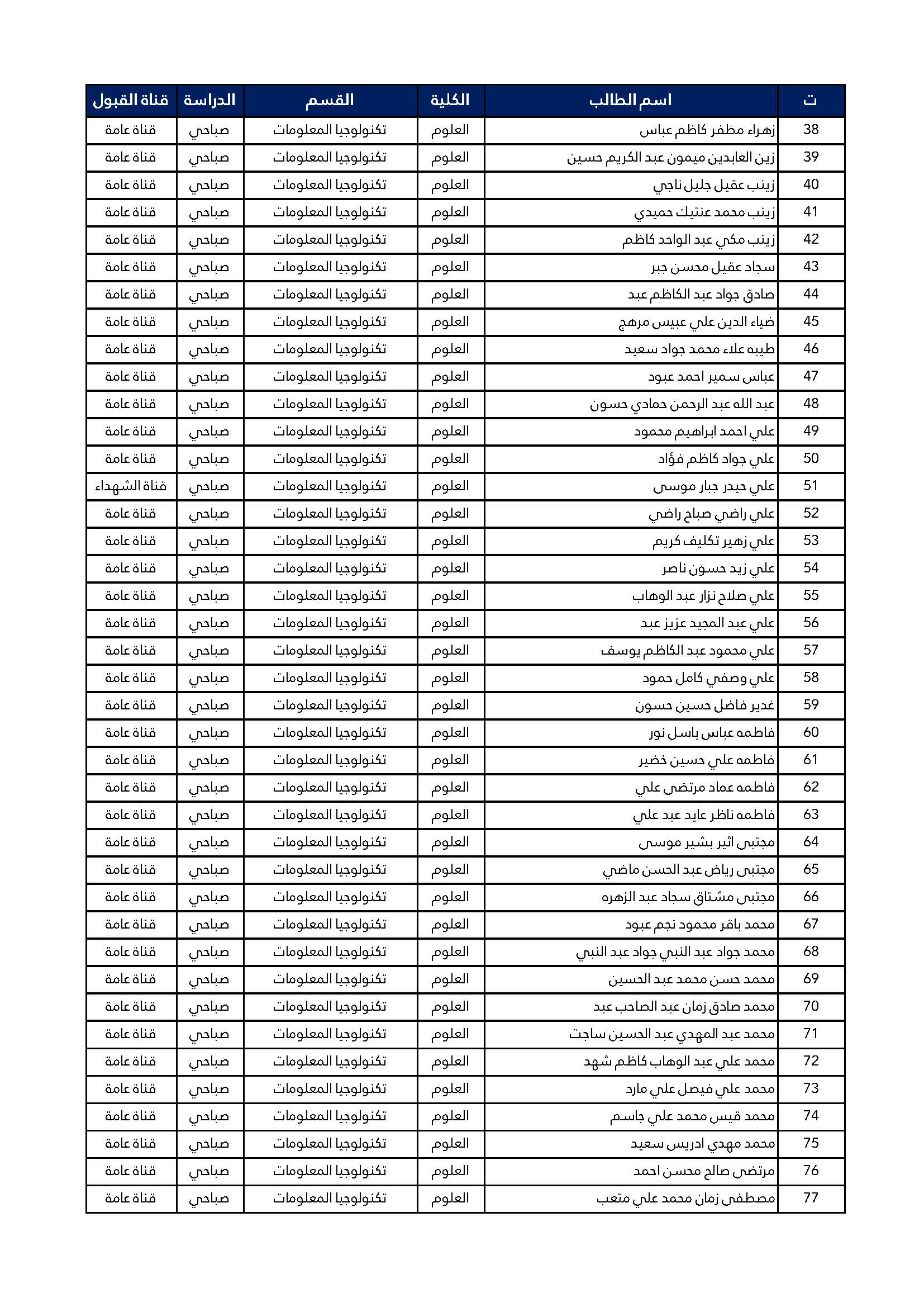 اسماء الطلبة المقبولين للدراسة الصباحية للمرحلة الاولى كلية العلوم قسم تكنولوجيا المعلومات