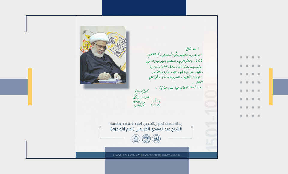 "الحمد لله رب العالمين وصلى الله على محمد وآله الطاهرين. أتقدم بالشكر الجزيل والامتنان الوافر للأخوة الأعزاء رئيس جامعة وارث الأنبياء وعمداء كلياتها وتدريسيها وطلبتها على ما يبذلونه من جهود متميزة في الكثير من المجالات التعليمية والتدريبية والخدمية وتلقي العلوم المختلفة. وأسأل الله تعالى لهم جميعاً دوام التوفيق."