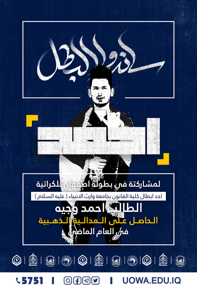 احرز الطالب في كلية القانون (احمد وجية) ذهبية بطولة اصفهان الدولية لرياضة الكاراتيه المقامة في جمهورية إيران، بمشاركة العديد من الرياضيين من دول عربية وأجنبية، للتنافس حول لقب البطولة، والتي احرزها طالبنا العزيز( احمد) بعد أداءٍ متميّز في تلك البطولة.
