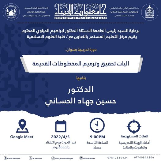 برعاية رئيس الجامعة الاستاذ الدكتور ابراهيم الحياوي يقيم قسم التعليم المستمر وبالتعاون مع كلية العلوم الاسلامية، دورة تدريبية بعنوان " آليات تحقيق وترميم المخطوطات القديمة " يلقيها الدكتور حسين جهاد الحساني