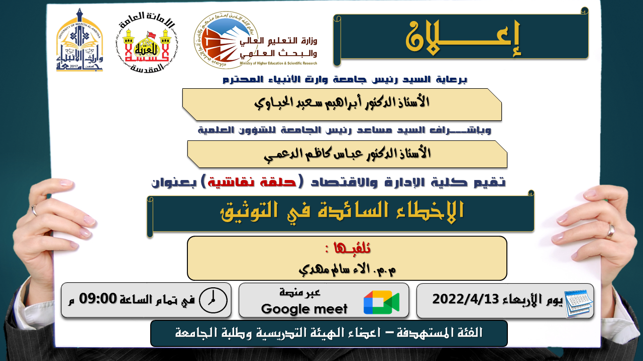 يقيم مركز التعليم المستمر في جامعة وارث الانبياء (عليه السلام) بالتعاون مع كلية الادارة والاقتصاد ندوة علمية بعنوان "الاخطاء السائدة في التوثيق"، تلقيها ... م.م الاء سالم مهدييوم الاربعاء الموافق 2022/4/13 ، في تمام الساعة الـ 9:00 مساءً ، علماً ان الندوة تستهدف الهيئة التدريسية وطلبة كلية الادارة والاقتصاد عبر منصة Google meet