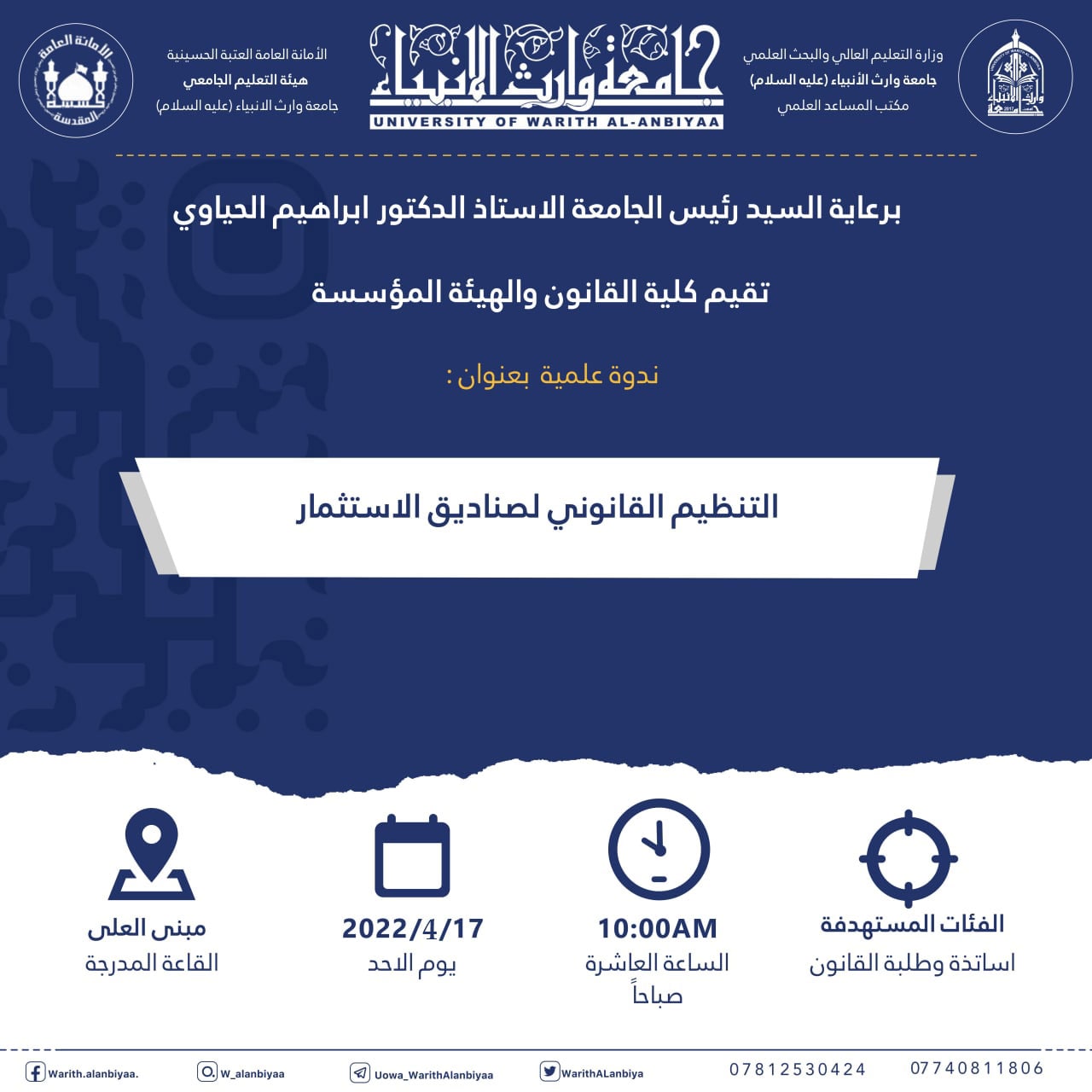 استثماراً للخبرات العلمية والأكاديمية في جامعة وارث الانبياء (عليه السلام) لتقديم الخدمات المجتمعيةوبحضور عدد من أعضاء مجلس النواب العراقي ورئاسة غرفة تجارة محافظة كربلاء المقدسة وهيأة استثمارها، وبرعاية السيد رئيس الجامعة الاستاذ الدكتور ابراهيم الحياوي، نظمت كلية القانون في الجامعة ندوة علمية بعنوان (التنظيم القانوني لصناديق الاستثمار).وقال رئيس الهيأة المؤسسة لجامعة وارث الانبياء(عليه السلام) الاستاذ الدكتور نوفل الاعرجي: تسعى الجامعة من خلال ما تمتلكه من طاقات أكاديمية في المساهمة بتطوير الواقع الاستثماري بمدينة كربلاء وذلك بالتشاور مع المسؤولين في المحافظة لجعل بيئة الاستثمار فاعلة لإستقطاب المستثمرين لتنفيذ المشاريع.حيث تم عقد الندوة لمناقشة عدد من المشاريع المهمة للواقع الاستثماري منها مشروع انشاء الخارطة الزراعية، ومشروع انشاء المدينة الصناعية، ومشروع انشاء المخازن الطولية للمواد الغذائيةبالاضافة الى مشروع مرآب استراتيجي على مداخل كربلاء الاربعة.