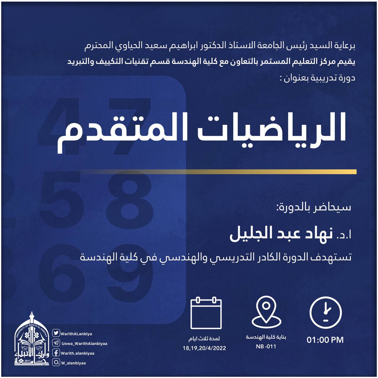 أ.د نهاد عبد الجليل لمدة ثلاثة أيام متتالية ابتداءً من اليوم الاثنين 18-4-2022
