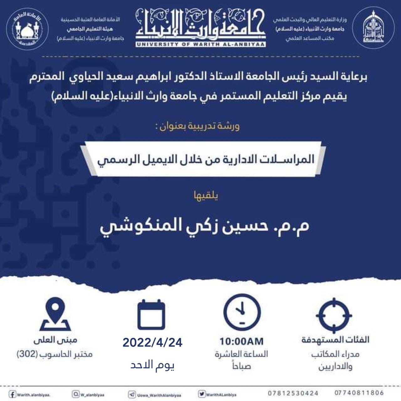 "المراسلات الادارية من خلال الايميل الرسمي"، يلقيها م.م حسين زكي المنكوشي اليوم الاحد 24-4-2022.