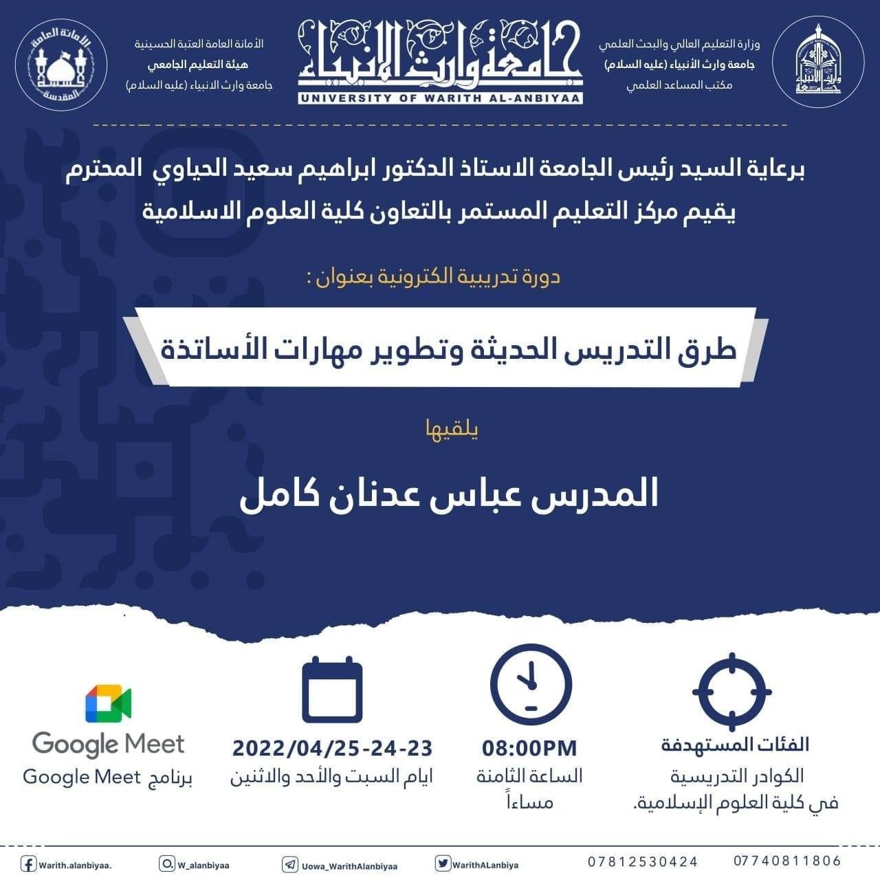 يلقيها المدرس عباس عدنان كامل، أيام السبت والاحد والاثنين 23-24-25/ 4/ 2022 وذلك عبر منصة google meet الالكترونية.