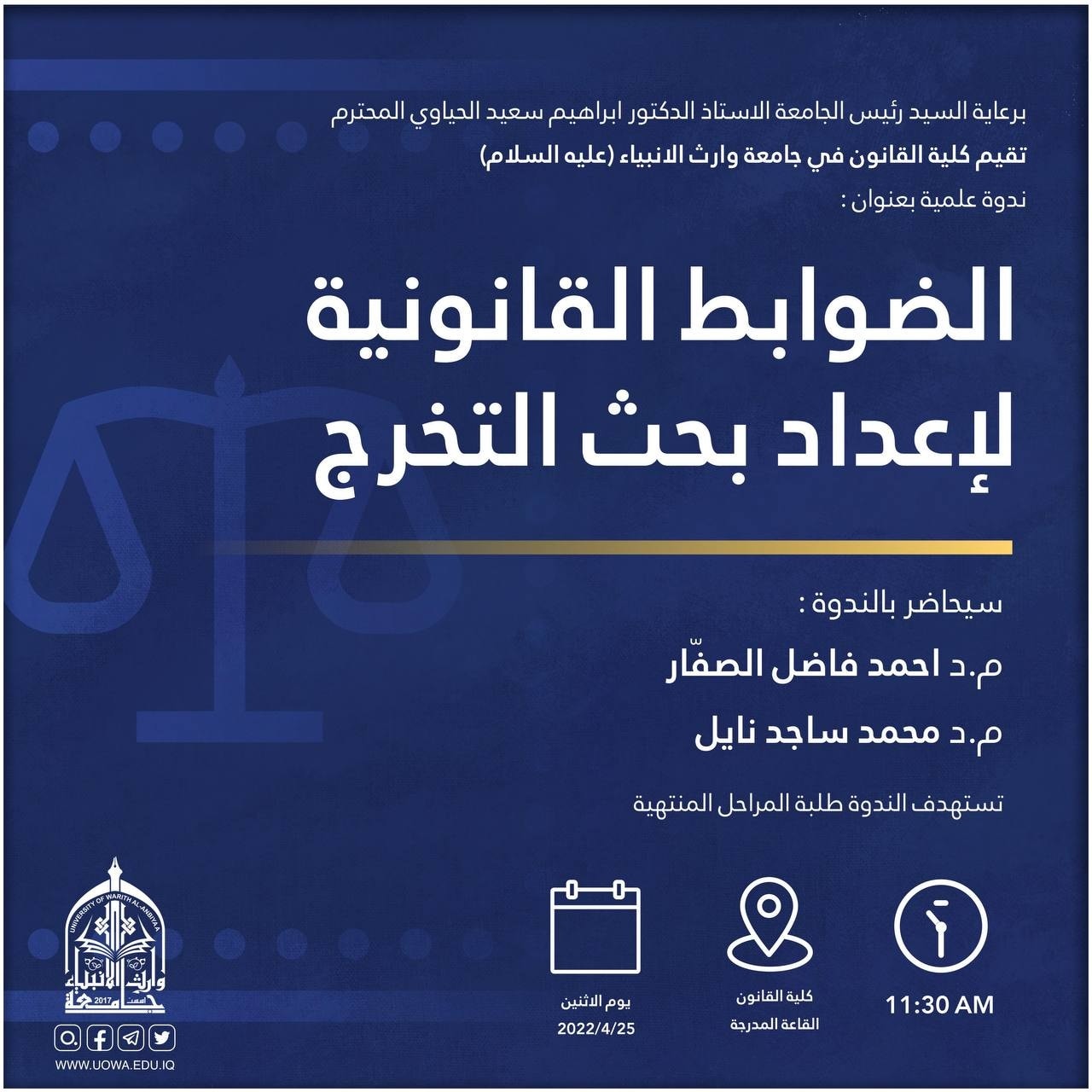 برعاية رئيس الجامعة الاستاذ الدكتور ابراهيم الحياوي تقيم كلية القانون في الجامعة ندوة علمية بعنوان "الضوابط القانونية لإعداد بحث التخرج"