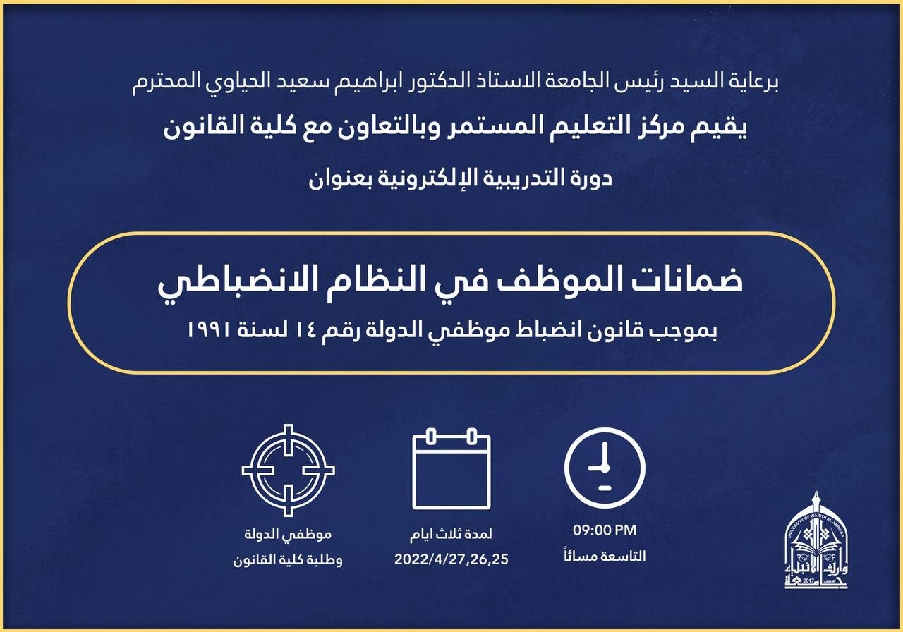 برعاية رئيس الجامعة الاستاذ الدكتور ابراهيم الحياوي يقيم مركز التعليم المستمر وبالتعاون مع كلية القانون دورة تدريبية الكترونية تحت عنوان "ضمانات الموظف في النظام الانضباطي" بموجب قانون انضباط موظفي الدولة رقم 14 لسنة 1991م.