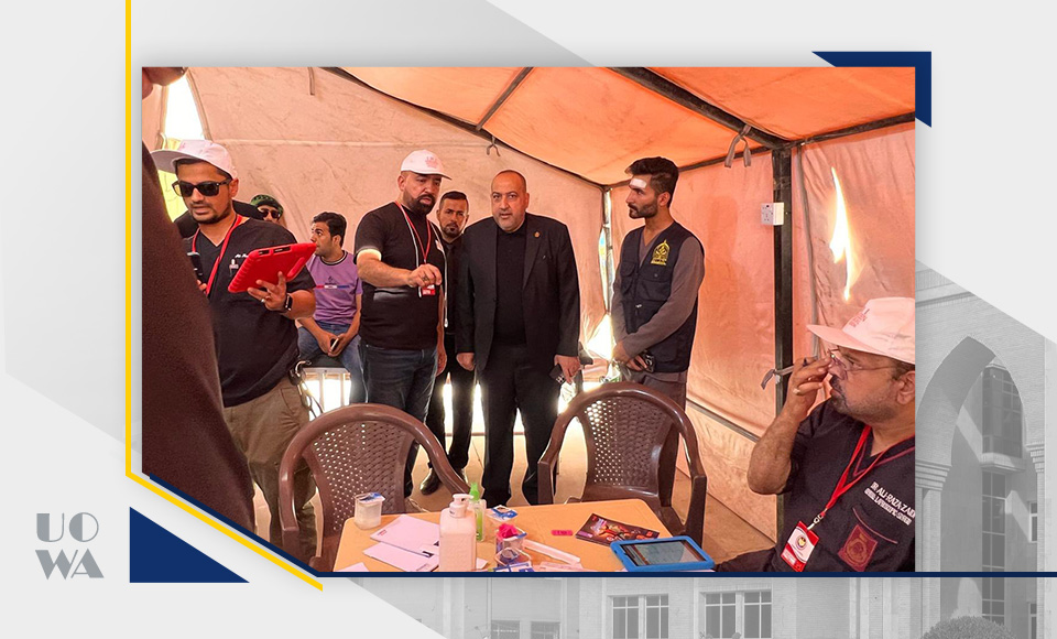 As part of his field supervision of services provided to the pilgrims of Imam Hussein’s (PBUH) Arbaeen, Professor Dr Ibrahim Saeed Al-Hayawi, President of the University of Warith Al-Anbiyaa (PBUH), inspected one of the medical posts operated by the university’s medical students in cooperation with the International Imamiyah Organisation.