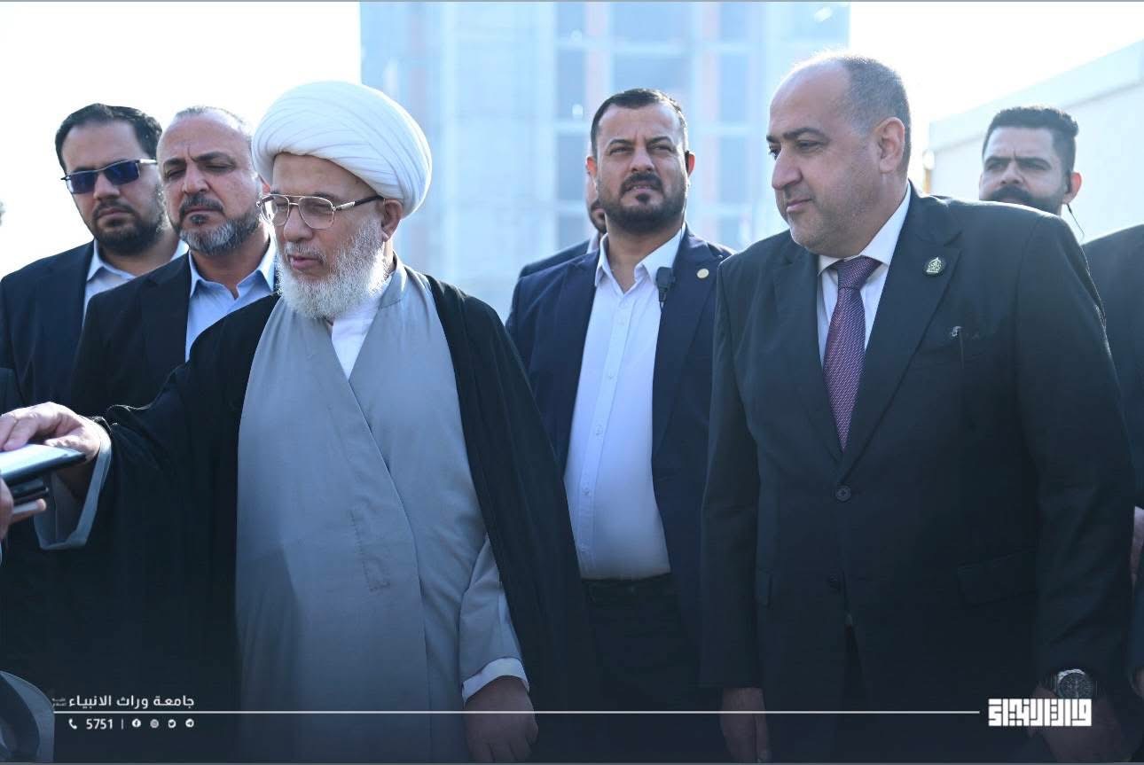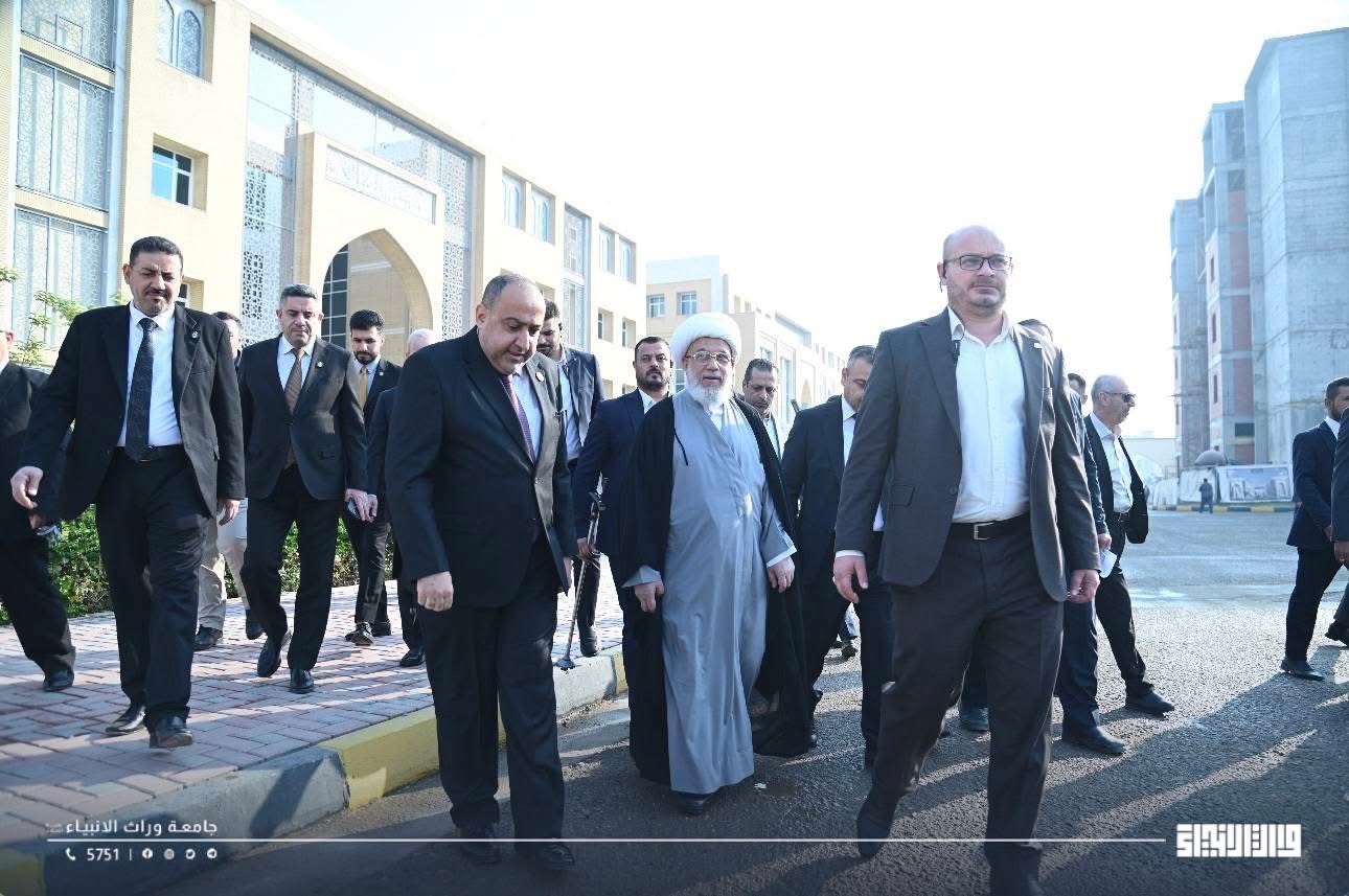 His Eminence Sheikh Abdul Mahdi Al-Karbalai, visited Warith Al-Anbiyaa University today. He was received by the University President, Professor Dr. Ibrahim Saeed Al-Hayawi, to conduct an inspection tour and review the ongoing expansion and development projects within the university.