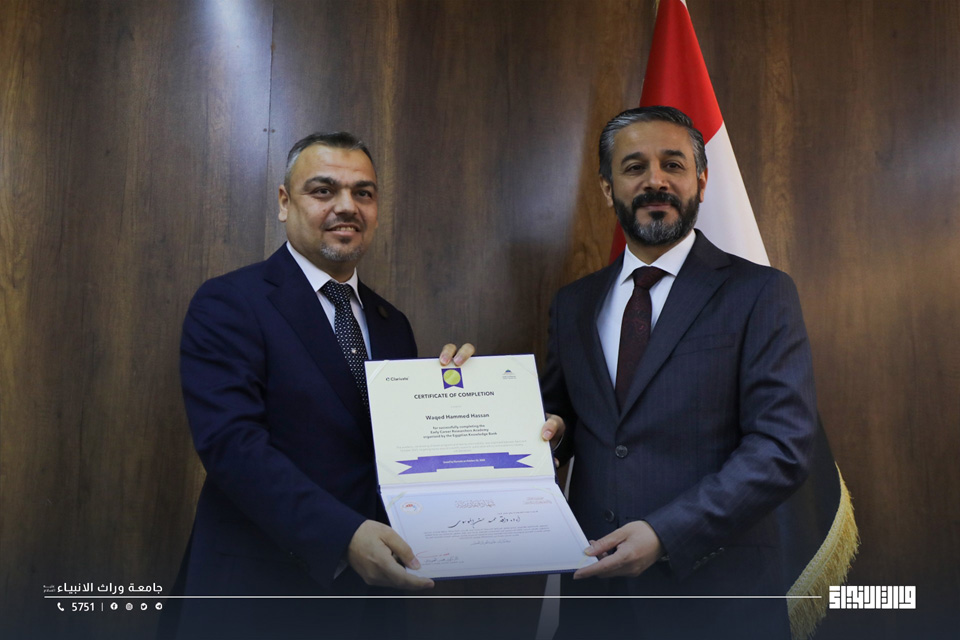 His Excellency the Minister of Higher Education and Scientific Research, Dr Naeem Al-Aboudi, honoured Professor Dr Waqed Hameed Al-Moussawi, Assistant President for Academic Affairs at Warith Al-Anbiyaa University, in recognition of his distinguished efforts and active contribution to a specialised training programme aimed at building the capacity of fifty Iraqi researchers and preparing professional trainers in the field of scientific research and academic development.