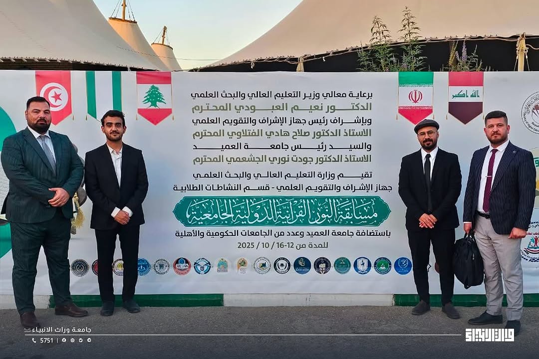 As part of Warith Al-Anbiya University's participation in the Al-Noor International University Quran Competition, organized by the Ministry of Higher Education and Scientific Research, with the participation of 53 Iraqi universities and 6 foreign universities from around the world, student Hafiz Muhammad Hassan Shamran from the College of Medicine won a distinguished award during the competition hosted by Al-Ameed University.