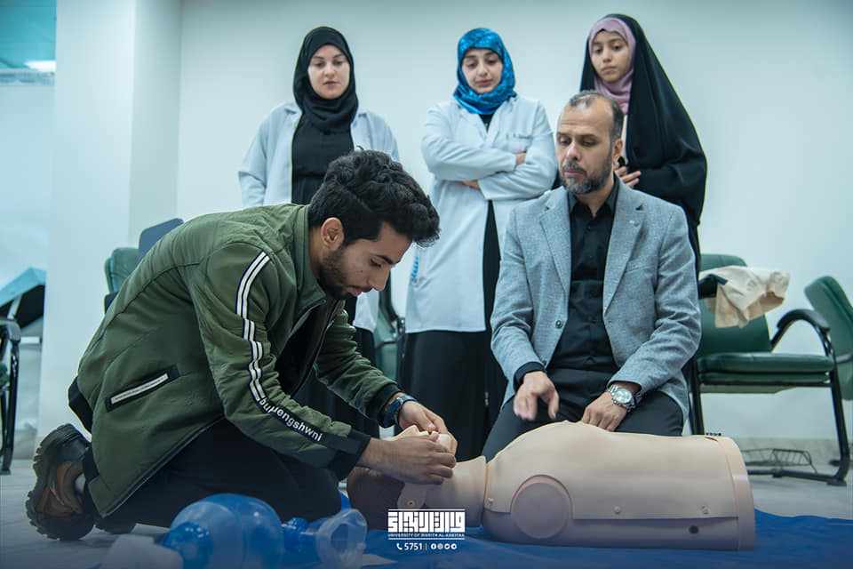 The College of Medicine at the University of Warith Al-Anbiyaa, in coordination with the Iraqi Red Crescent Society, Karbala Branch, organized a training workshop for the students of the college on "First Aid." The workshop included training participants on how to provide first aid to patients and injured individuals in emergency situations and accidents, covering all necessary steps to deal with these situations in a simplified manner, with practical application to facilitate learning and wise decision-making to prevent these problems.