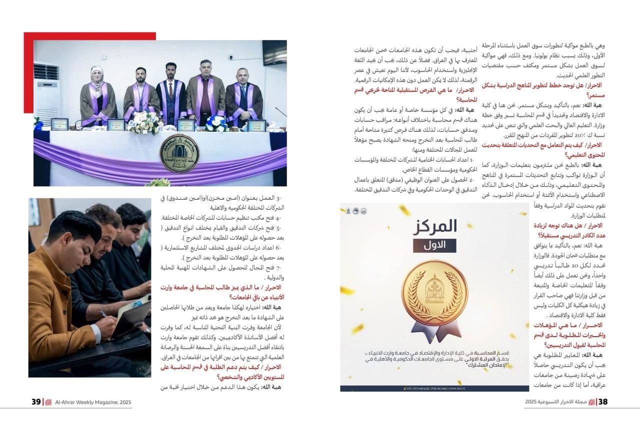 Al-Ahrar Magazine, published by the Publishing Division of the Media Department at the Holy Hussayniya Shrine, featured an insightful interview conducted by colleague Hawraa Masri, a second-year student in the Digital Media Department, with Dr. Hebatallah Mustafa Al-Sayyid, Head of the Accounting Department.